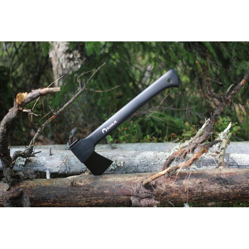 Velbalansert, lett og solid øks for tur- og hyttebruk. Slire med beltefeste og hempe for oppheng medfølger. Øksehode i rustfritt stål. Vridningssterkt og kraftig skaft iglassfiber.