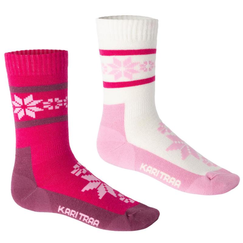 Kari Traa Rusa Sokk er en varm ullsokk i jacquardstrikk med tofarget nordisk-inspirert mønster. Den gir støtte i fotbuen og har forsterket hæl og tå-parti for komfort og holdbarhet. Sokkene har frottèfôr og flate sømmer over tærne for å unngå gnaging. Kommer i 2pk.