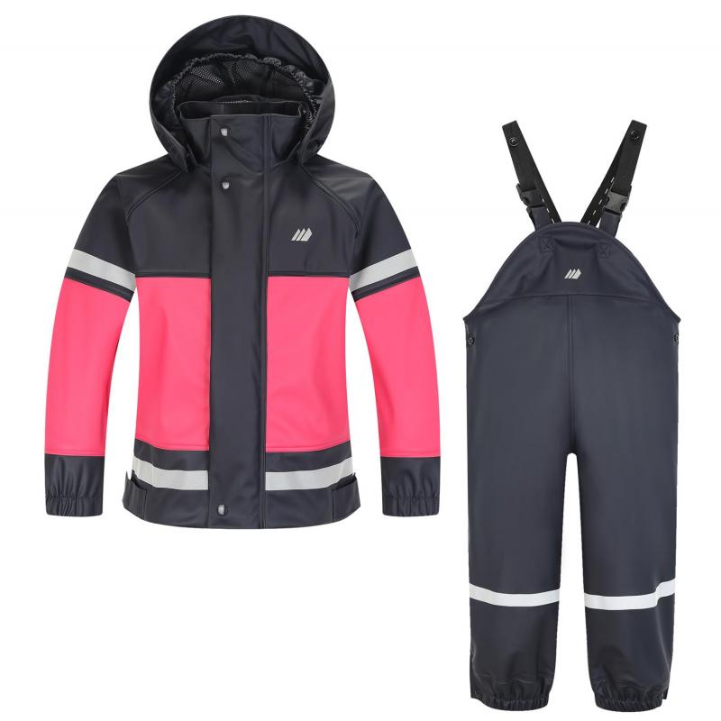 Vandtett og vindtett sett bestående av jakke og bukse i PU-materiale. Ona er et slitesterkt sett som har justerbare seler, avtagbar hette og fotstropper. Settet har i tillegg reflekselementer strategisk plassert på både jakke og bukser, så er man sikret at barna er synligere i mørket. Et solid alternativ på regnværsdager, med gode muligheter for justeringer på størrelse og passform.